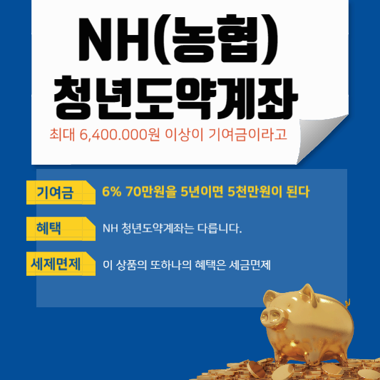 NH 청년도약계좌는 젊은 34세까지의 청년들에게 장기적으로 ( 최장5년) 동안 자산을 구축하여 목돈을 만들어 주는 금융상품입니다.