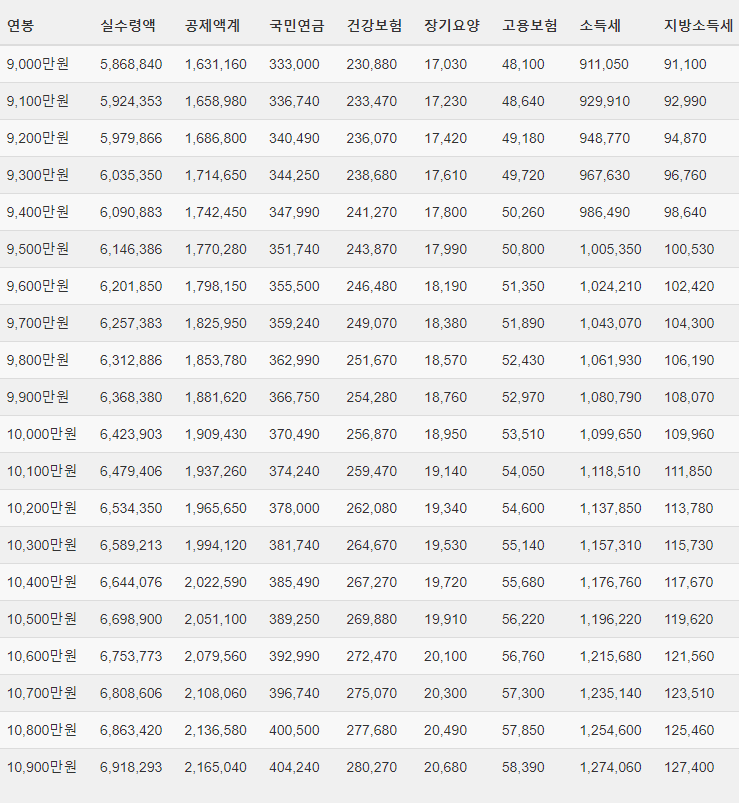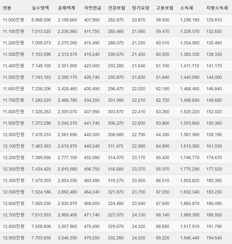 소득세와 주민세: 근로자의 연봉에 따라 정해진 비율로 공제되며, 이는 근로자의 연간 총 수입에 따라 달라집니다.